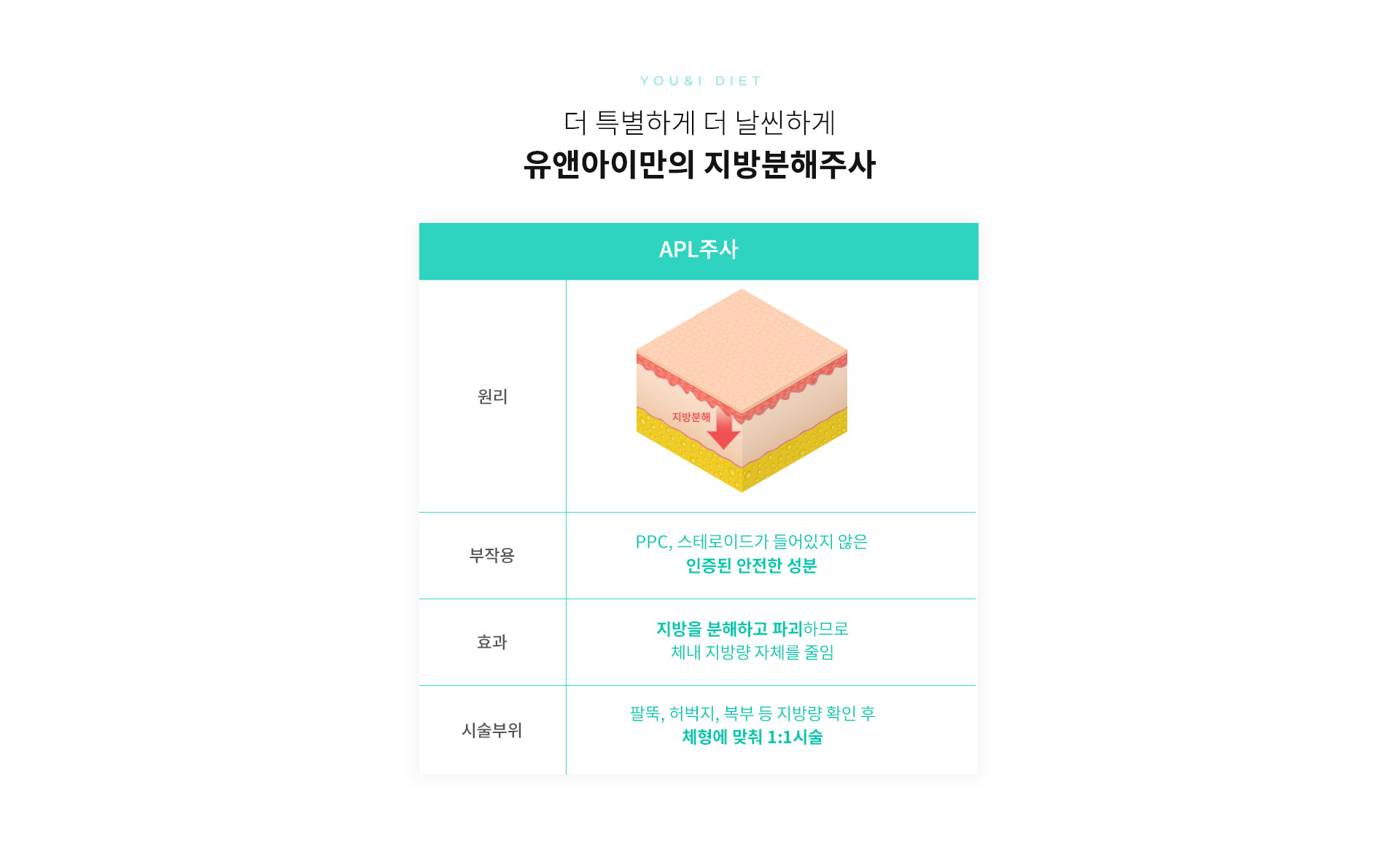 확씬 다이어트 프로그램은 유앤아이만의 프리미엄 다이어트 패키지로 체형에 맞춰 1:1 맞춤 시술이 가능합니다.