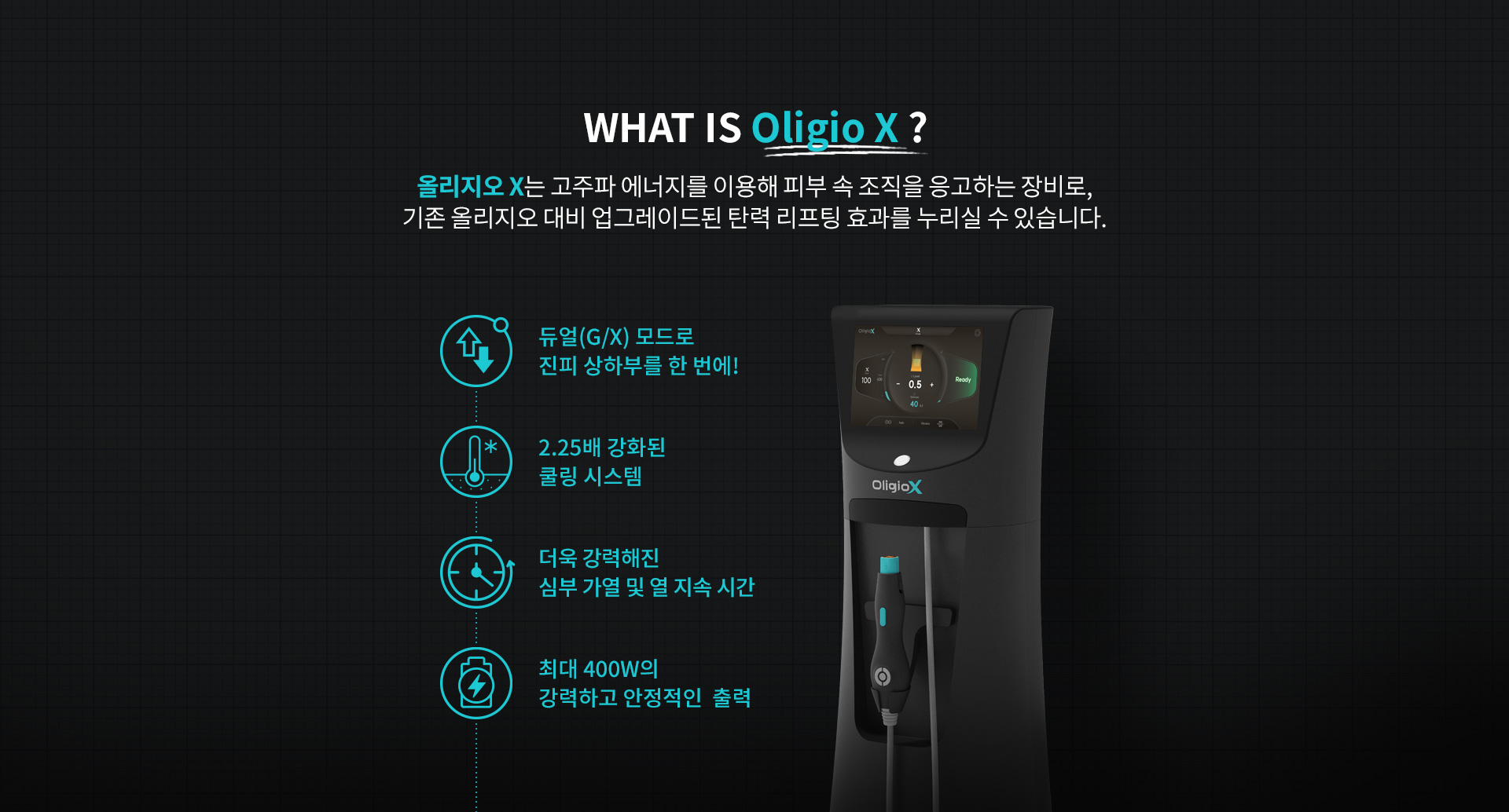 올리지오X는 기존 올리지오의 업그레이드 버전으로, 혁신적인 듀얼모드를 통해 리프팅 효과를 높였습니다.